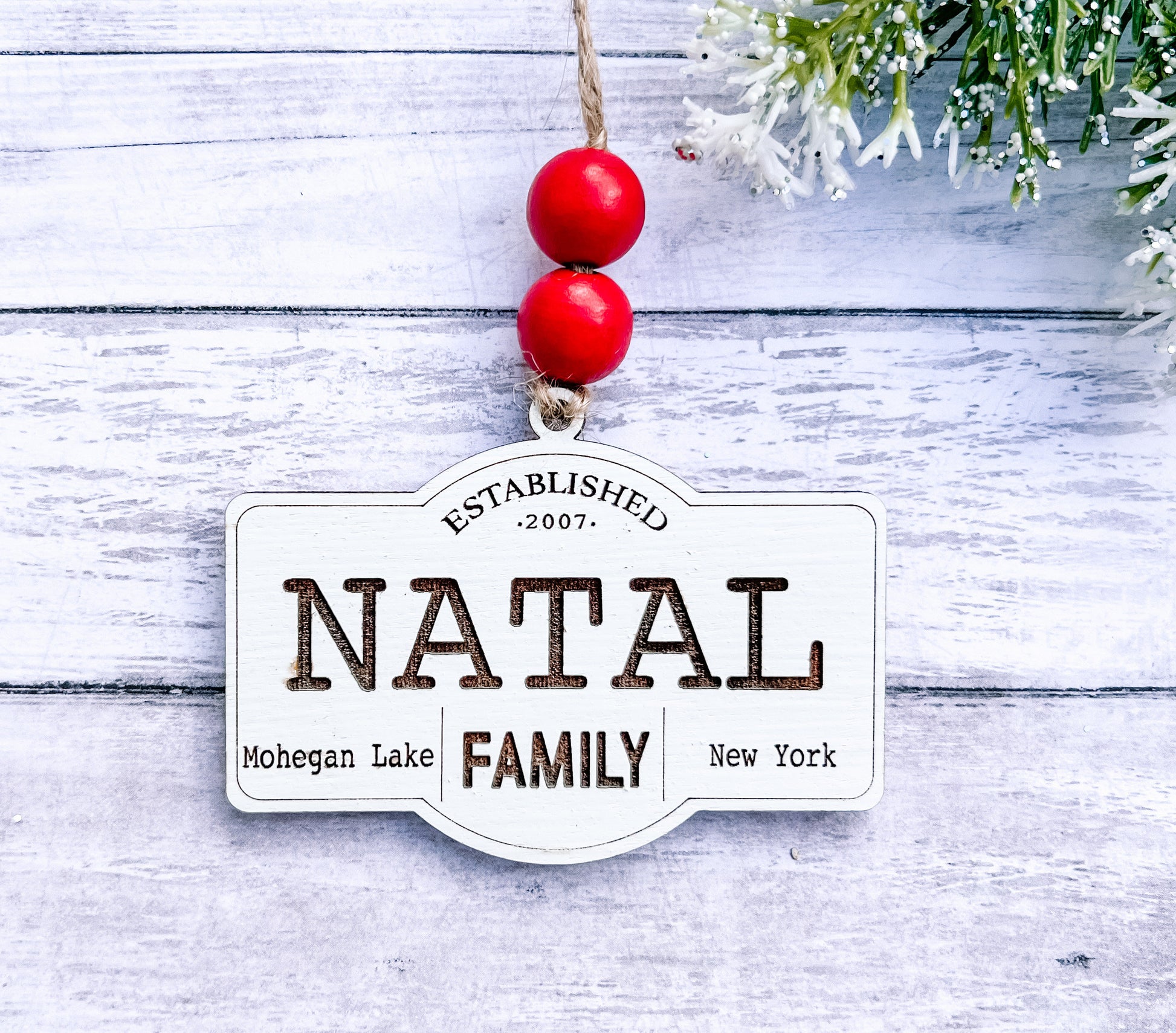 Each 3.5"X2.5" white wood ornament features a personalized engraving of your family name, city and state.