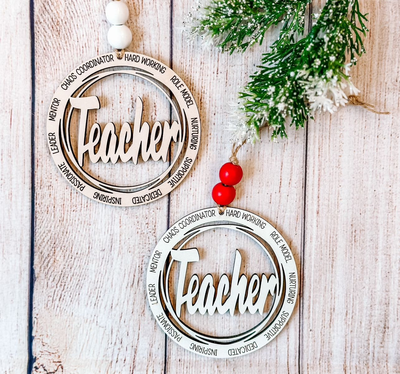 Thank the teachers in your child's life this year with a commemorative ornament. The word “Teacher” is displayed in the middle, surrounded by words that describe our favorite educators - hard working, role model, but urging, supportive, dedicated, inspiring, passionate, leader, mentor, chaos coordinator.